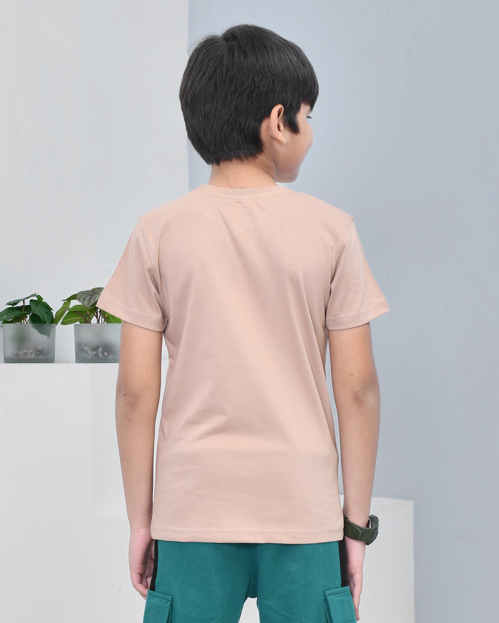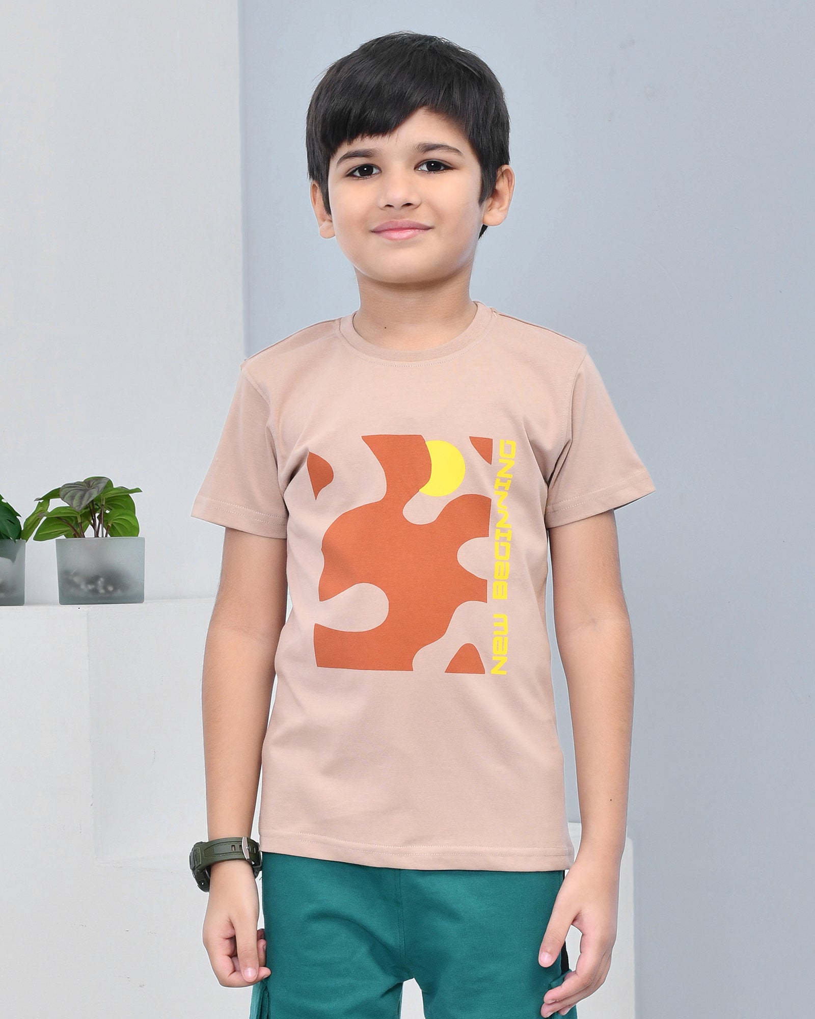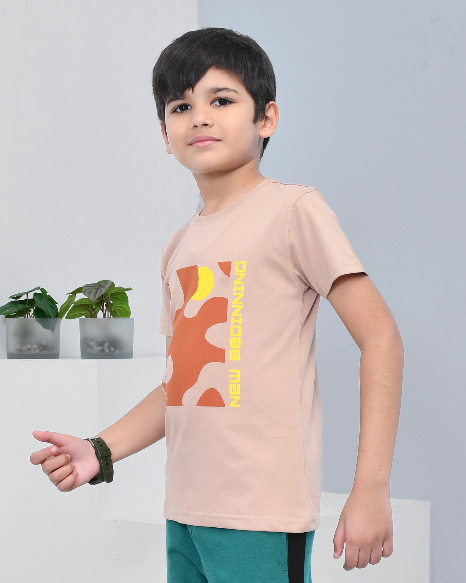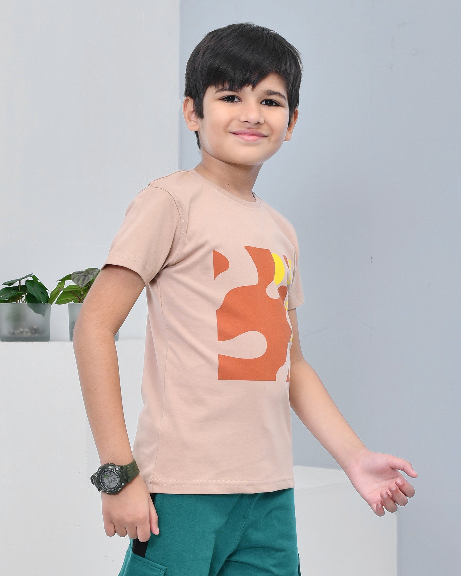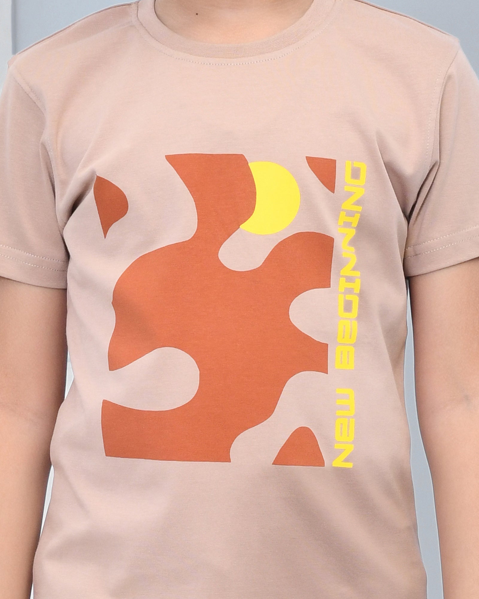 Youmaa 100% Cotton Half Sleeves Abstract Printed T-Shirt - Beige