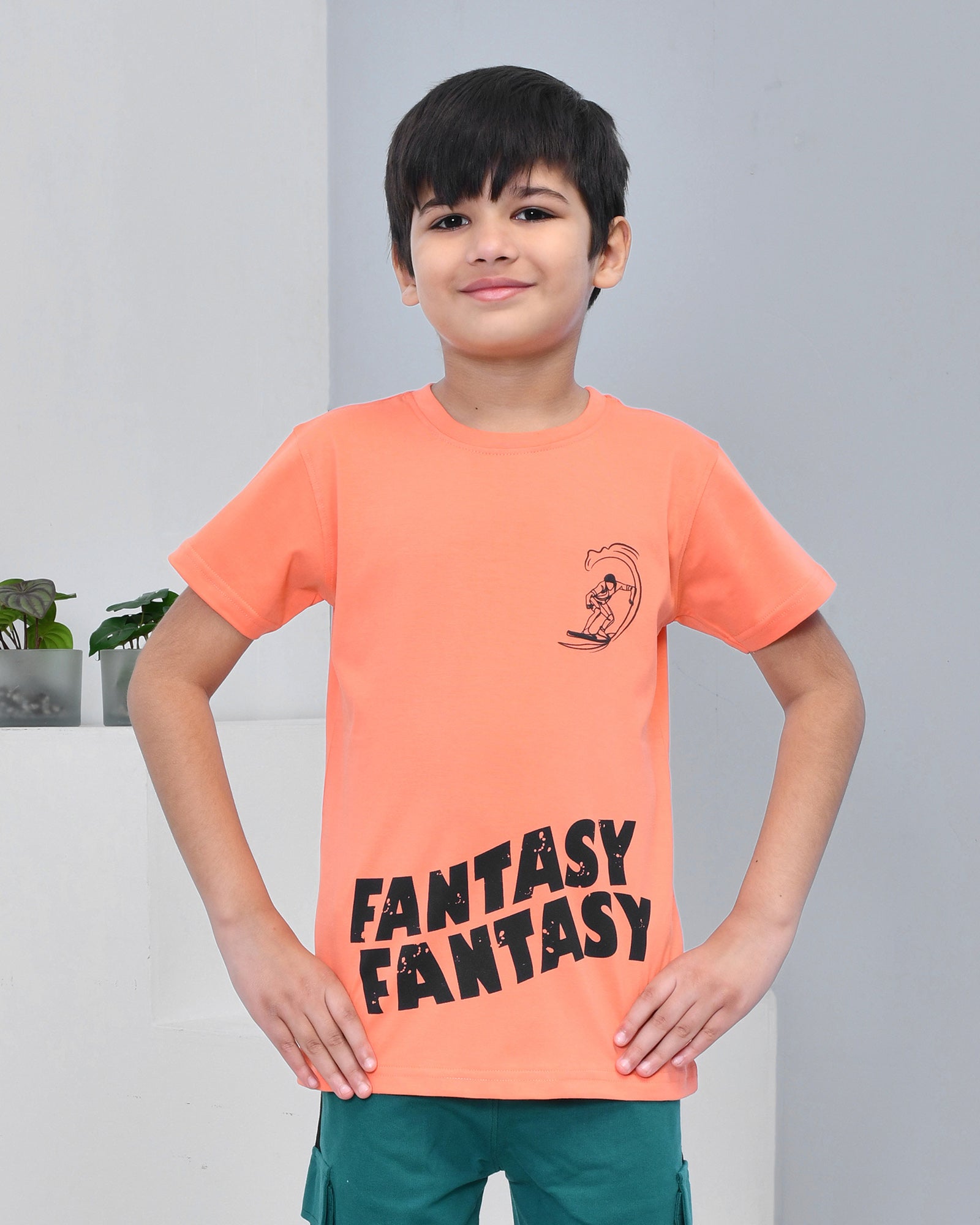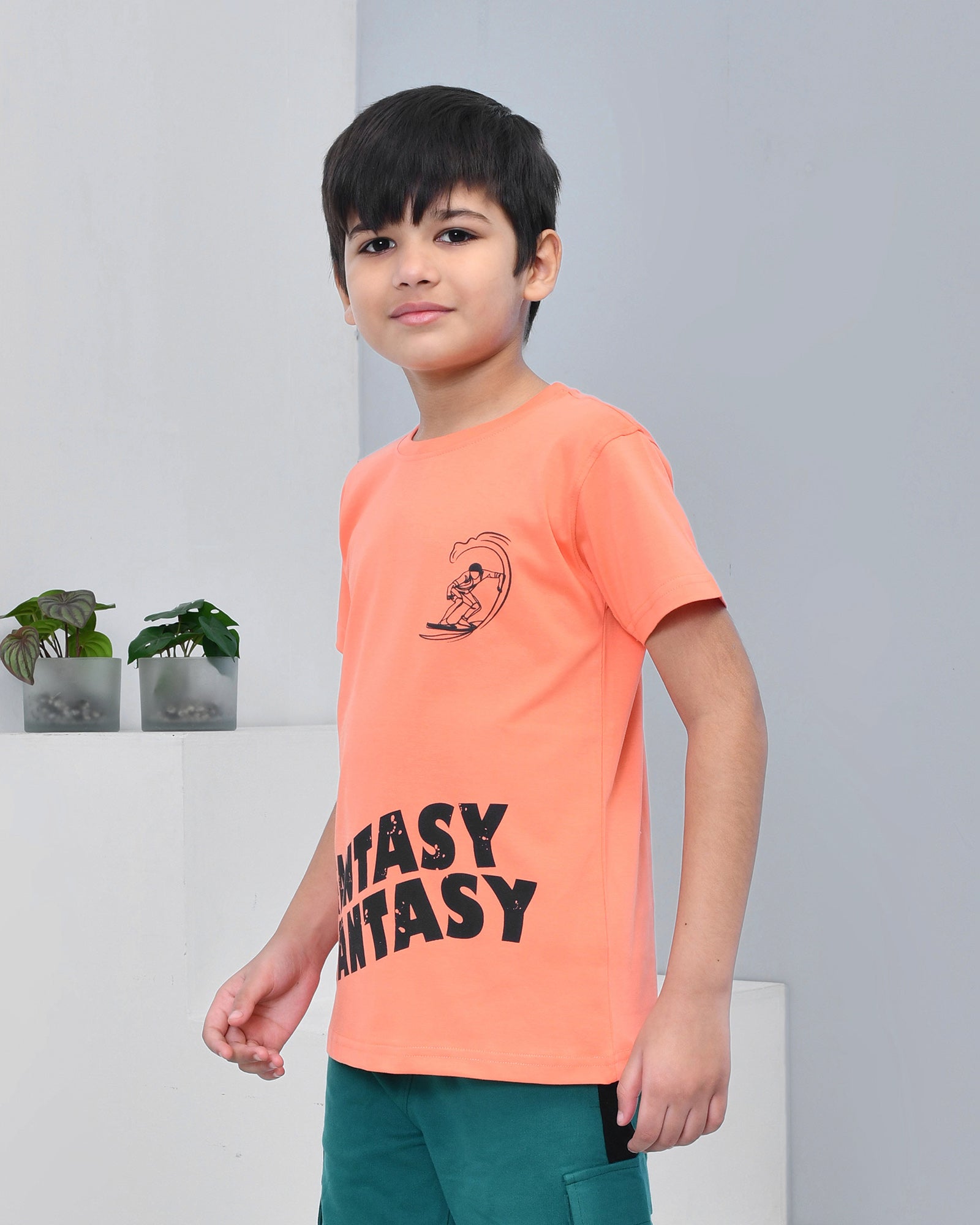 Youmaa 100% Cotton Half Sleeves Surfing Graphics Printed T-Shirt - Orange