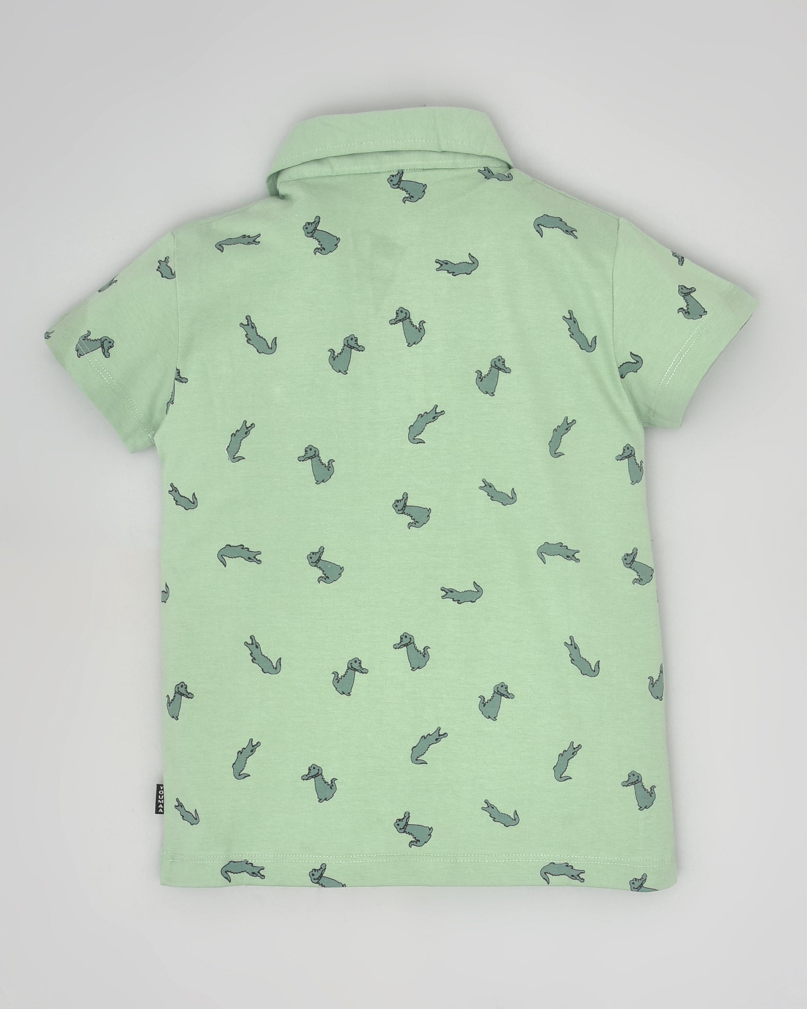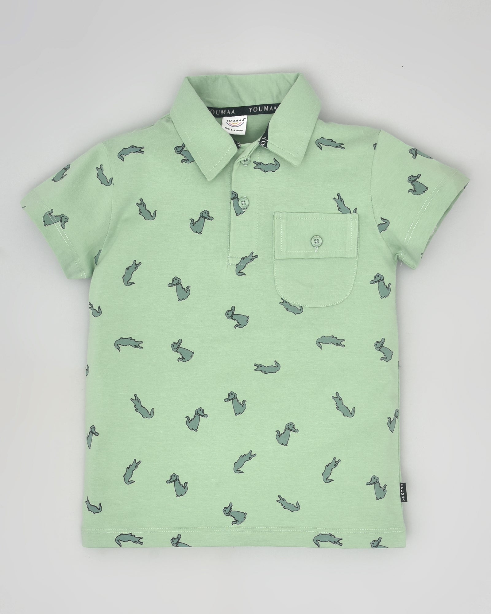 Youmaa Boys -100% Cotton Knits Polo Player Tshirt - Collared Half Sleeves-Dinasaur Print -Regular Length- Micro Fibre Cloud Wash Softness-Green