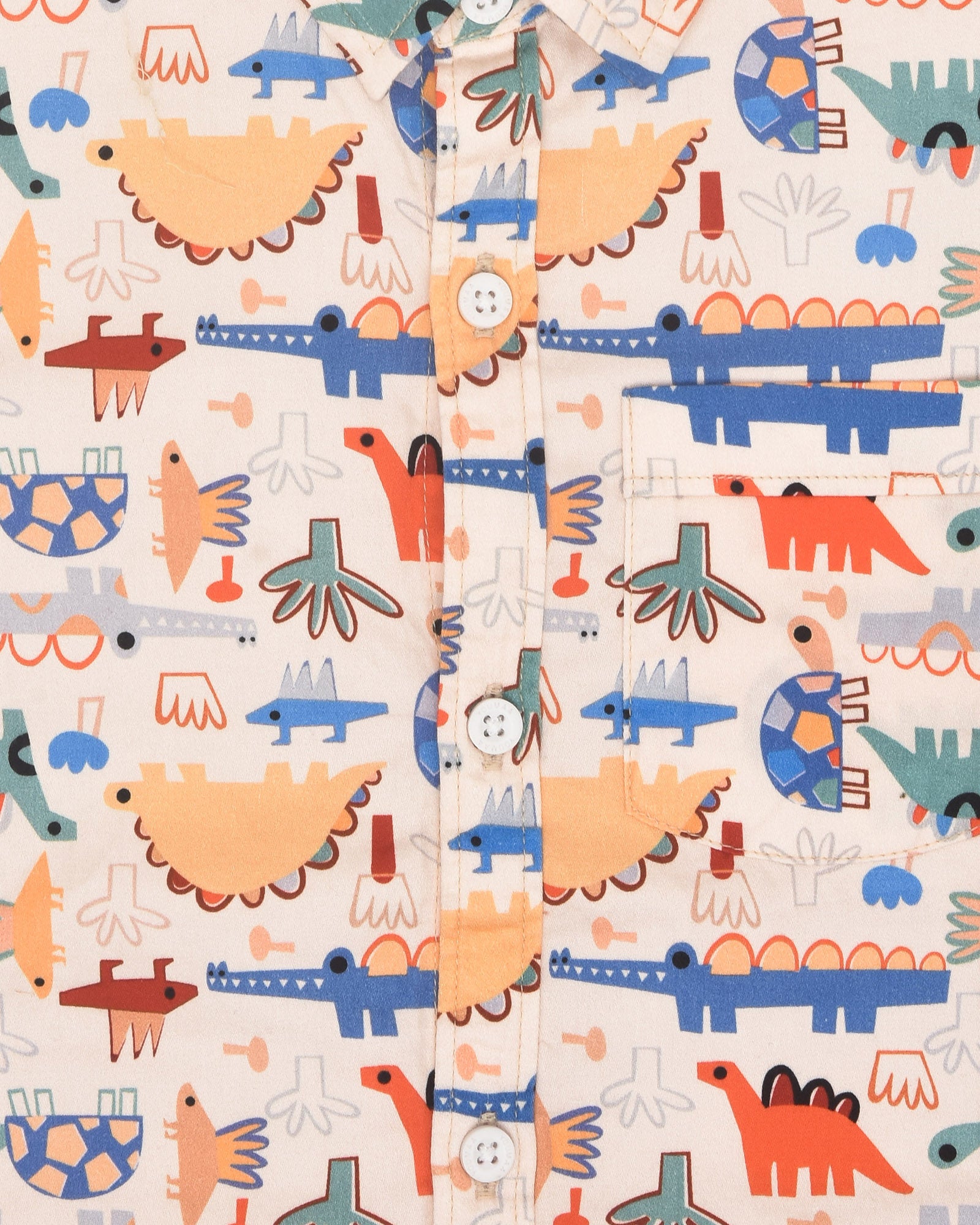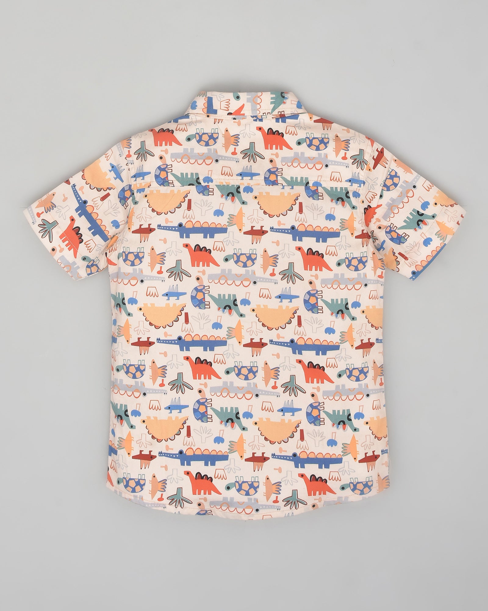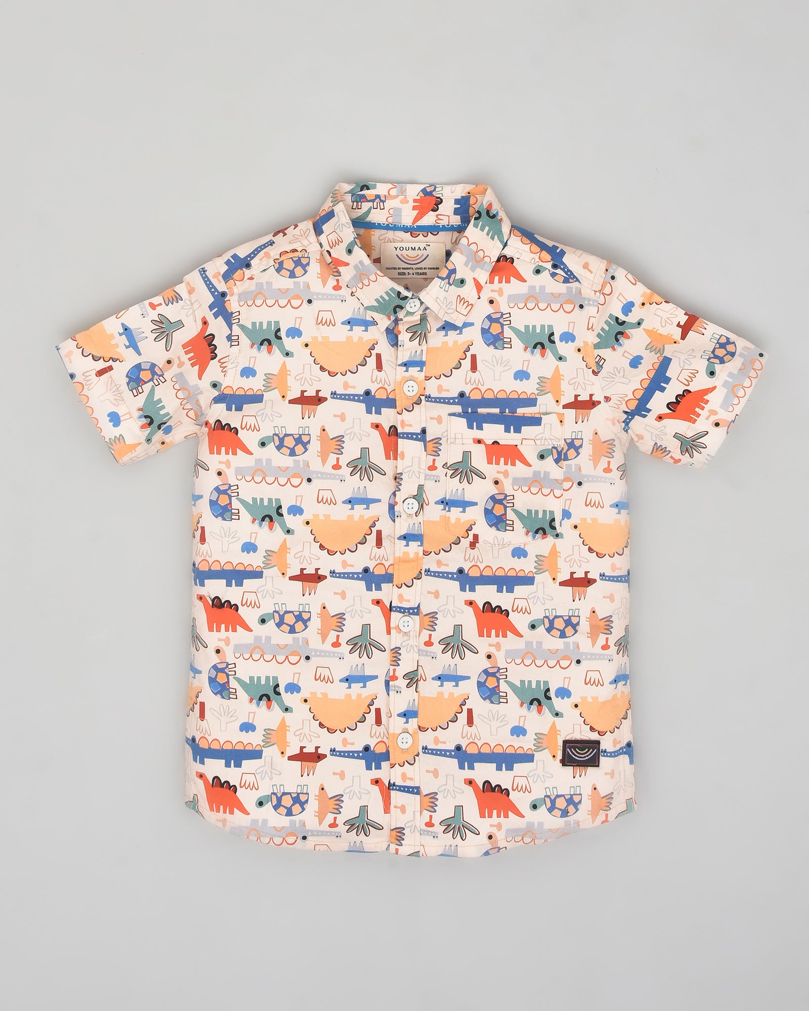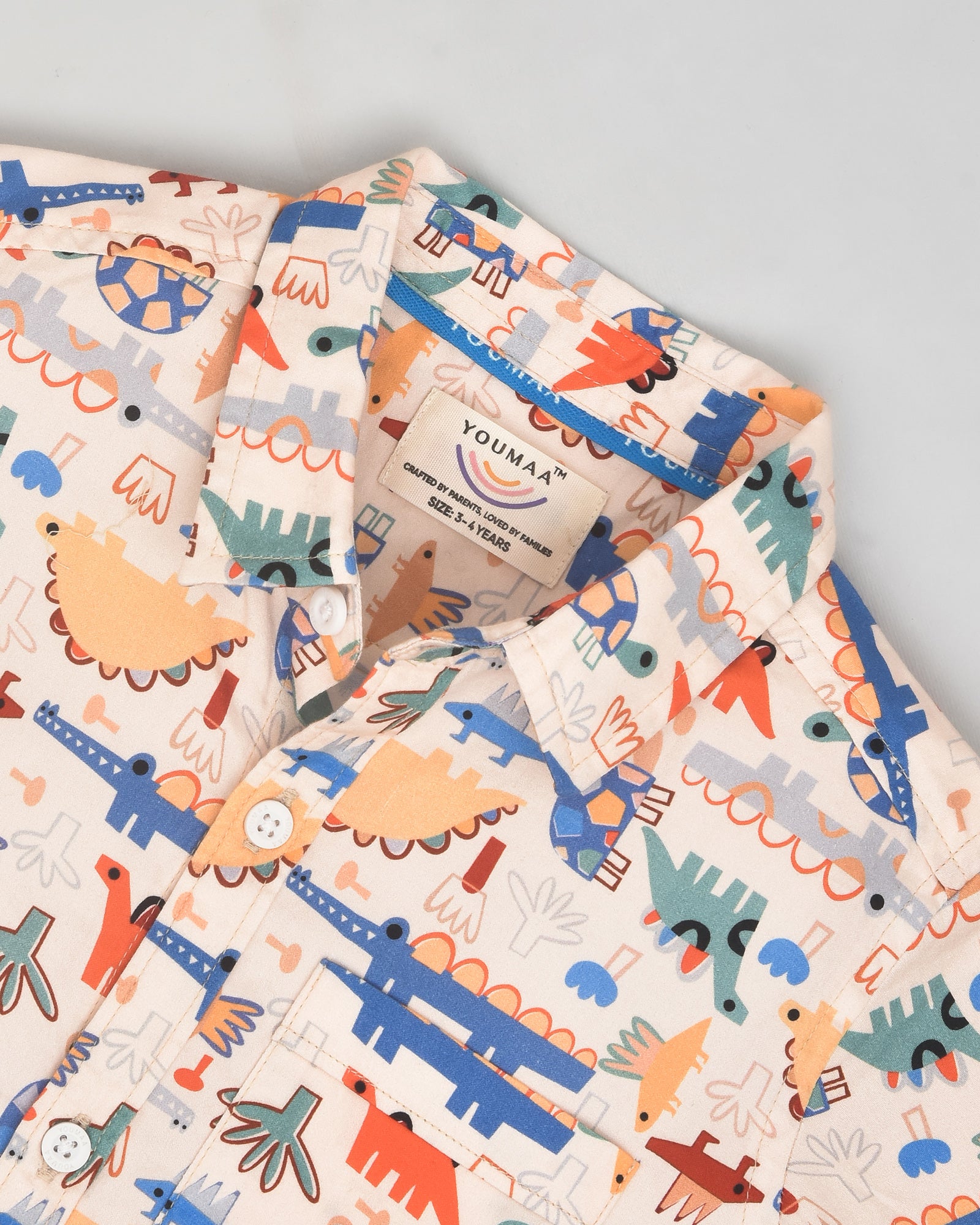 Youmaa 100% Cotton Half Sleeve Dino Adventure Printed Shirt Peach