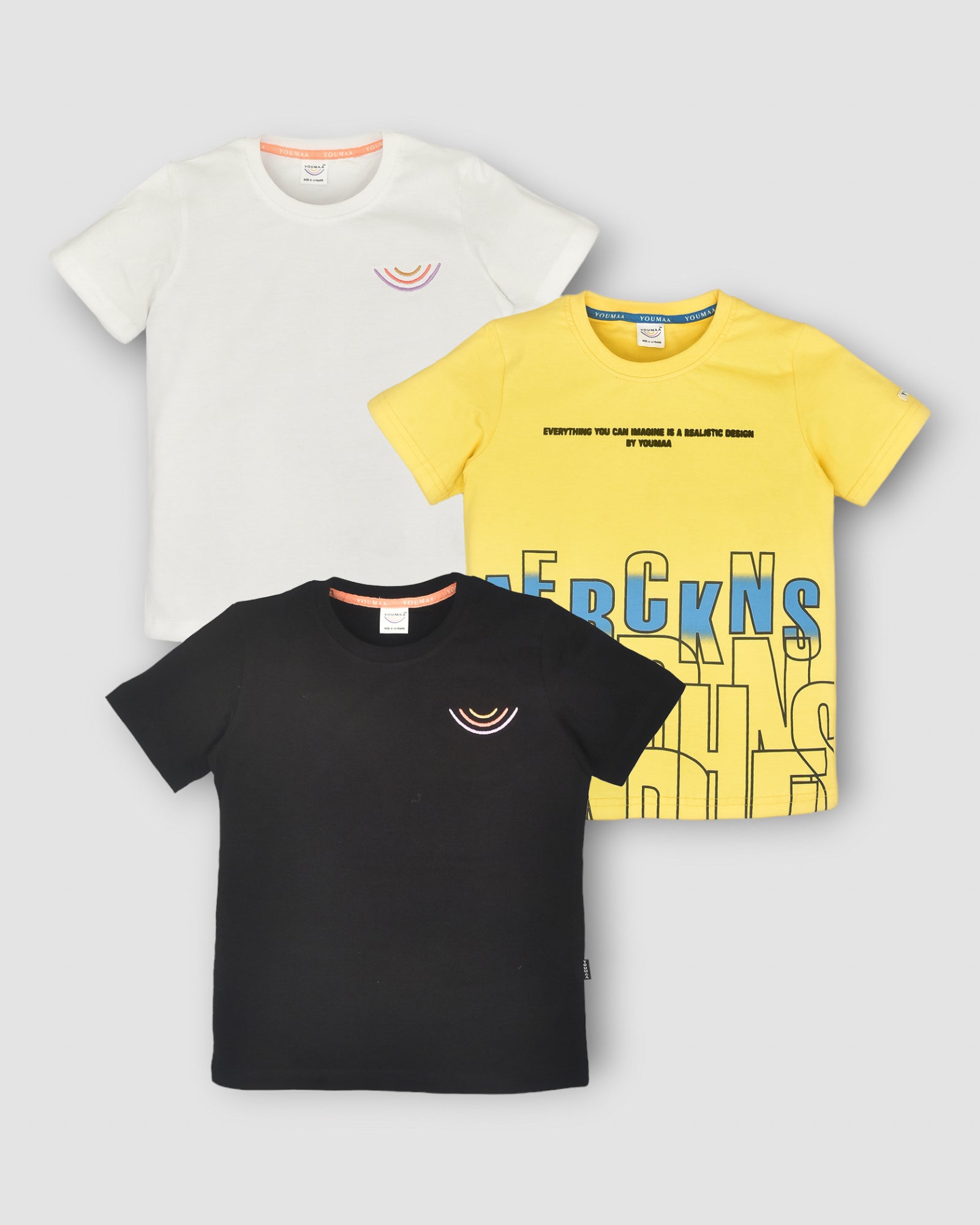 Youmaa-Trio Pack Tshirt-Half Sleeves -Chest Print Alphabet -Solid Plain -Soft Cloud Touch Fibre 100% Cotton Knits