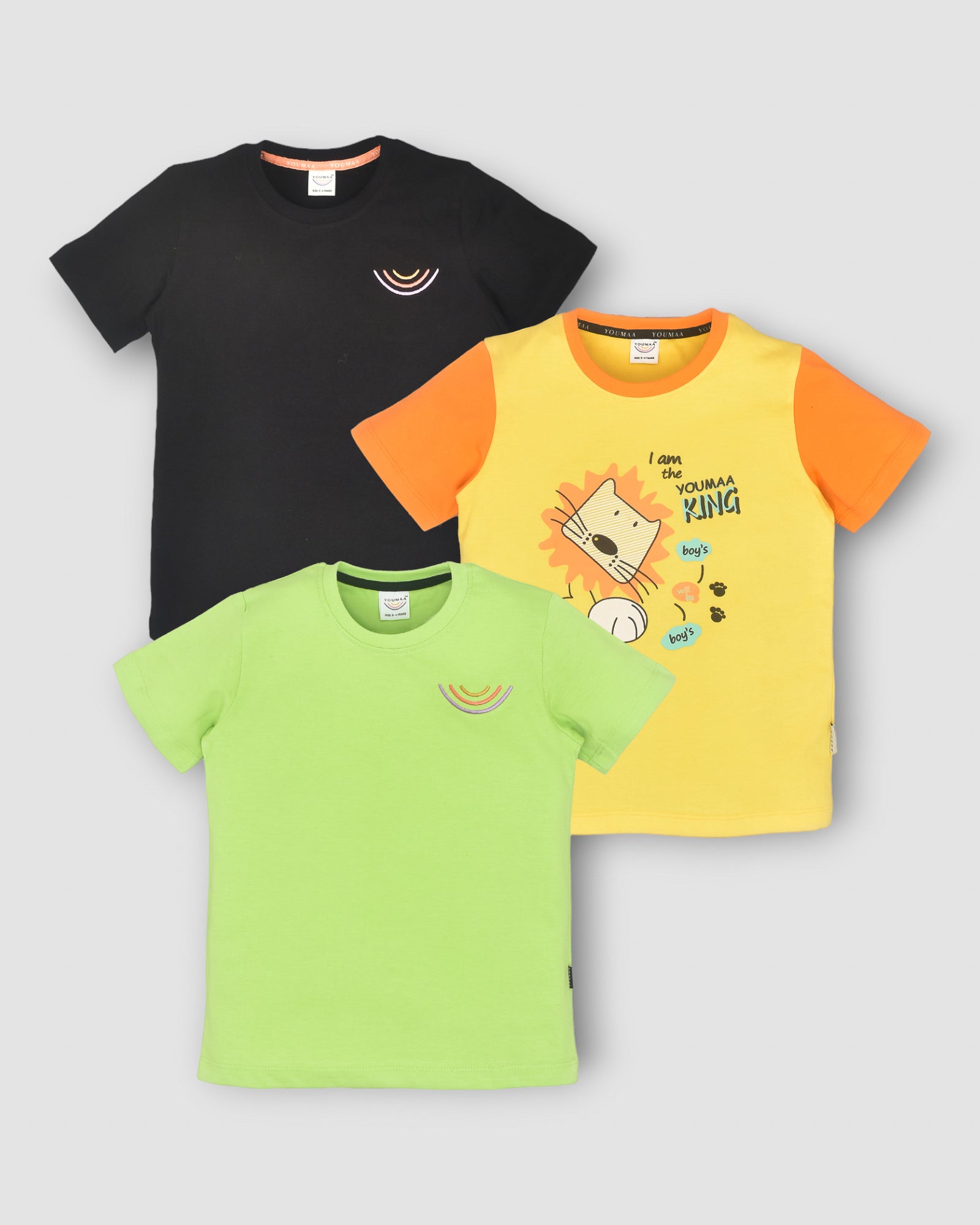 Youmaa-Trio Pack Tshirt-Half Sleeves -Chest Print Character Cartoon Holiday -Solid Plain -Soft Cloud Touch Fibre 100% Cotton Knits