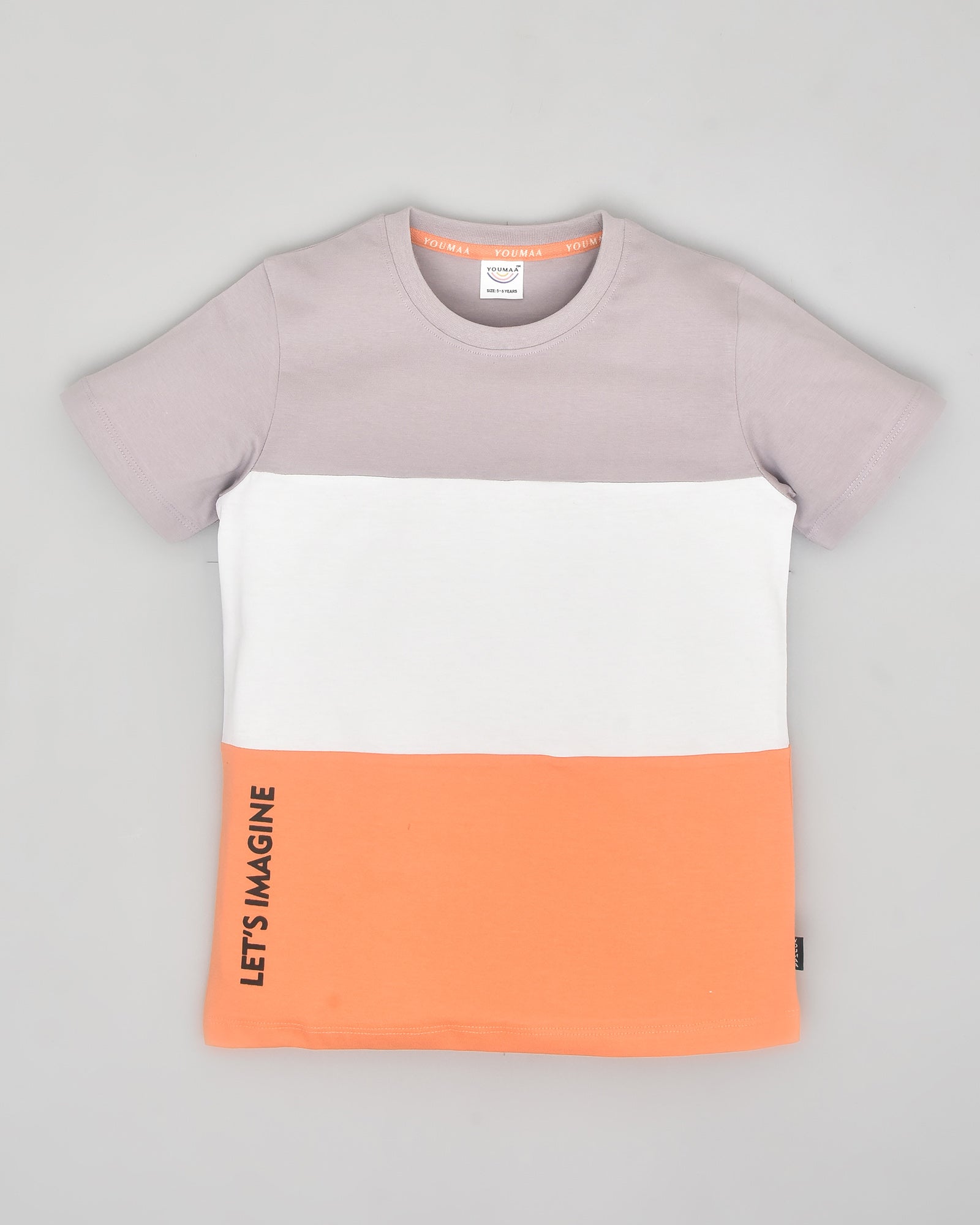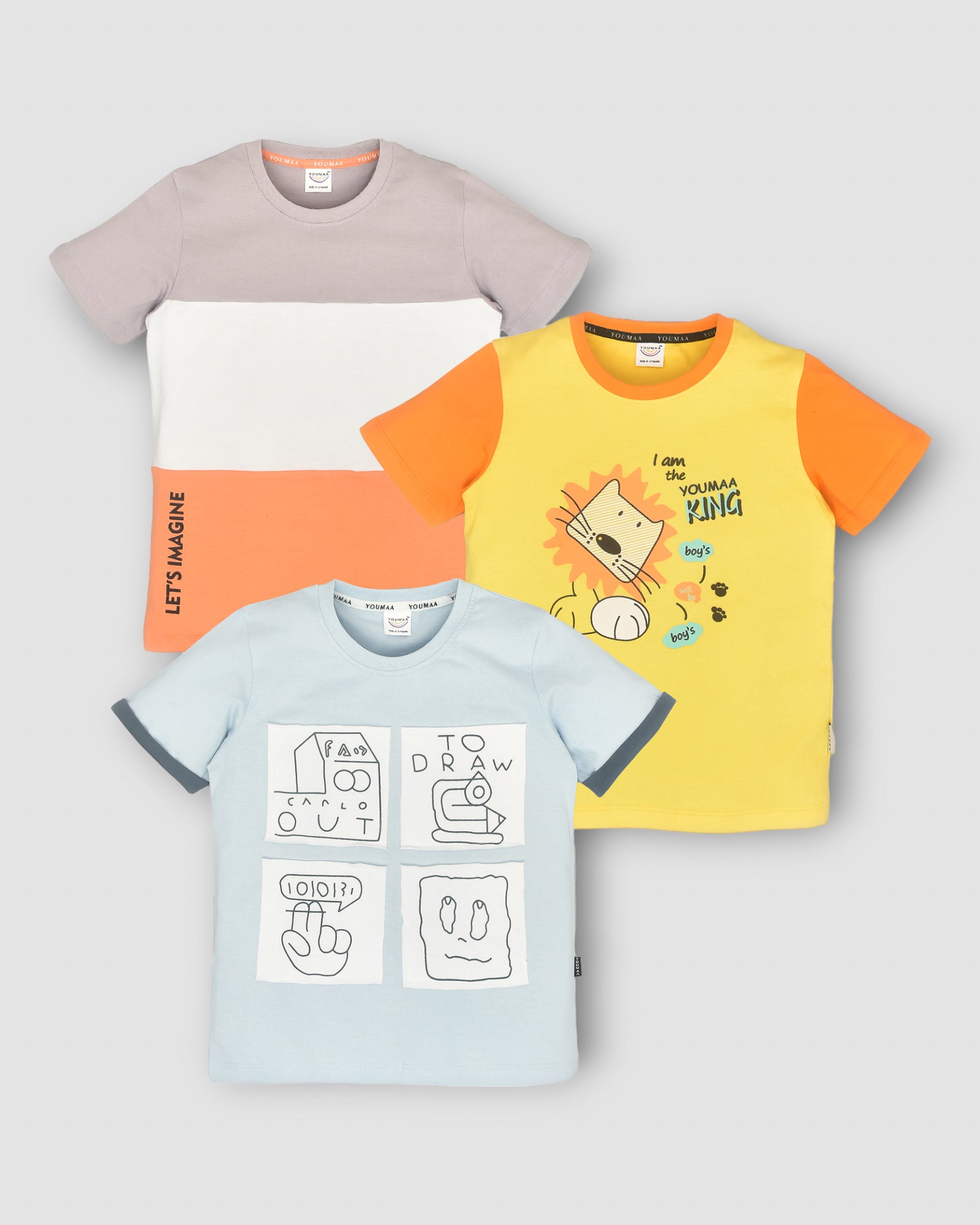 Youmaa-Trio Pack Tshirt-Half Sleeves -Chest Print-Colour Block -Solid Plain -Soft Cloud Touch Fibre 100% Cotton Knits