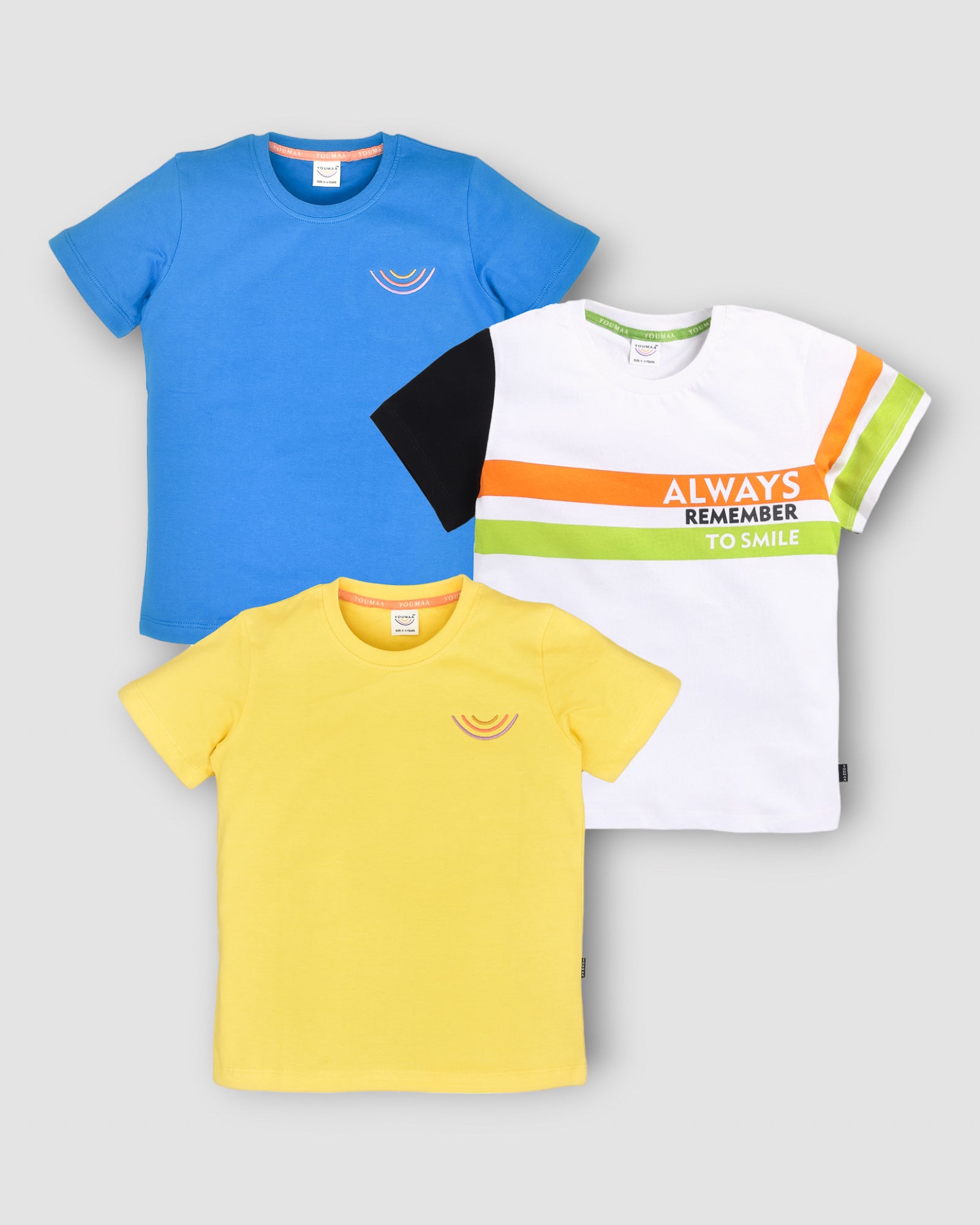 "Get a trio of style and comfort with Youmaa's Trio Pack T-shirts. These t-shirts feature half sleeves, chest prints in a trio of colors, and solid plain designs. Made from soft Cloud Touch Fiber 100% Cotton Knits, these shirts ensure your child stays comfy all day long. Mix and match these versatile shirts for endless outfit possibilities.