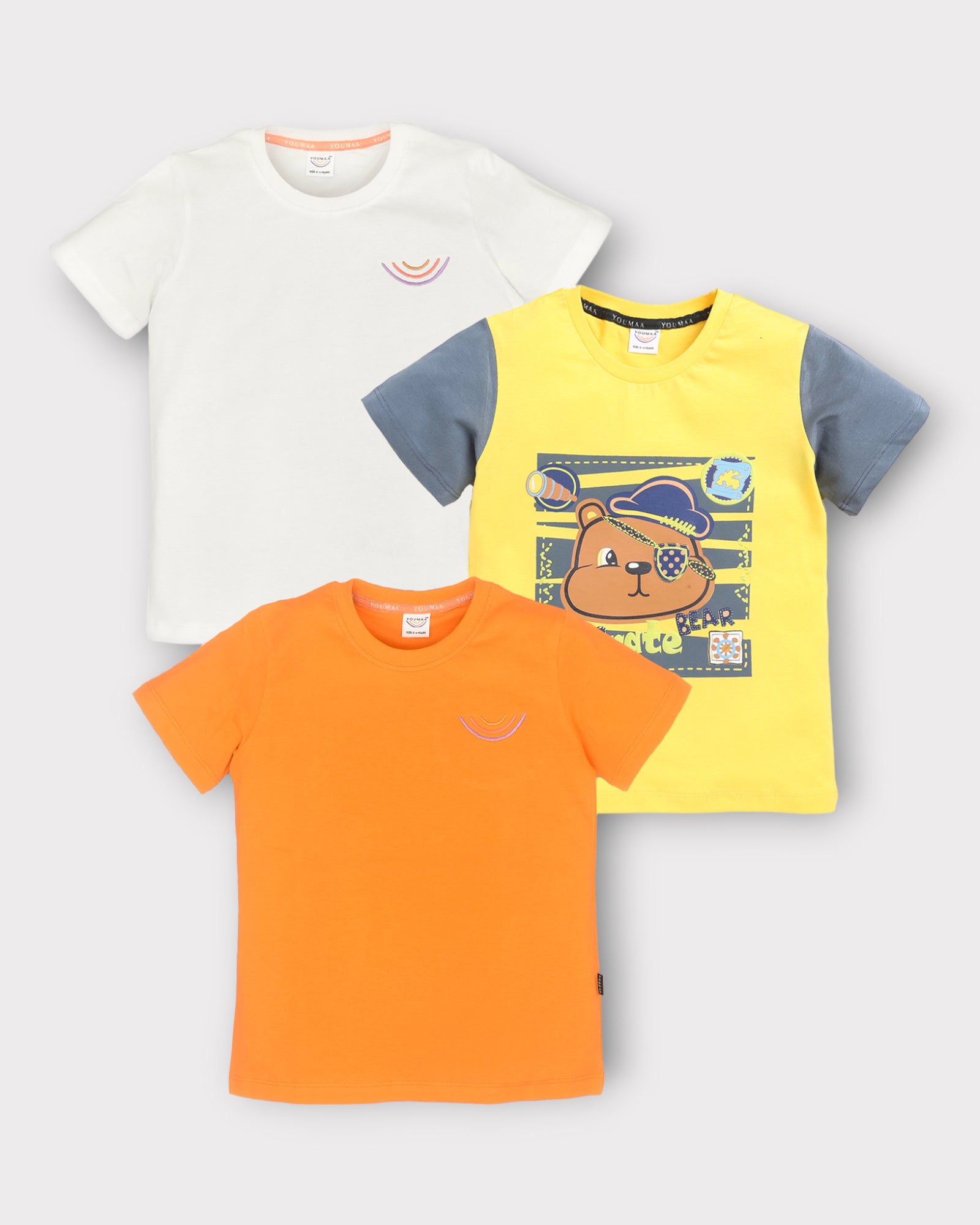 Youmaa-Trio Pack Tshirt-Half Sleeves -Teddy Applique -Solid Plain -Soft Cloud Touch Fibre 100% Cotton Knits